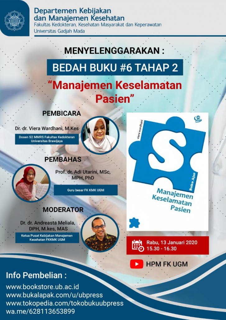Pada kegiatan Bedah Buku mendatang, akan menguraikan buku dengan judul “Manajemen Keselamatan Pasien” Tahap II dengan Penulis Buku: dr. Viera Wardhani, M.Kes. yang dilaksanakan via daring melalui aplikasi Zoom pada: