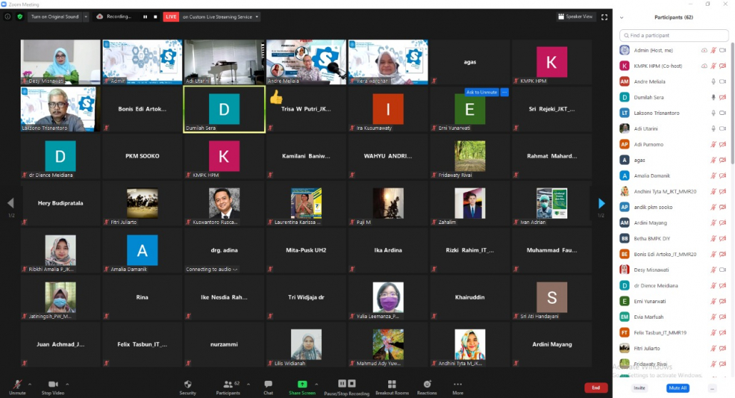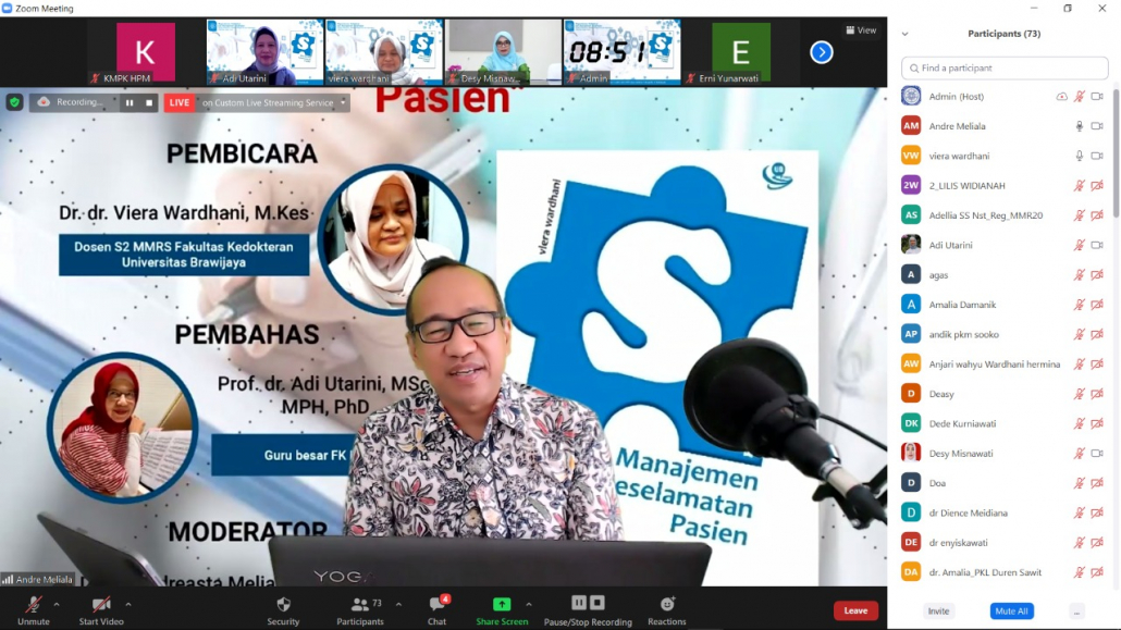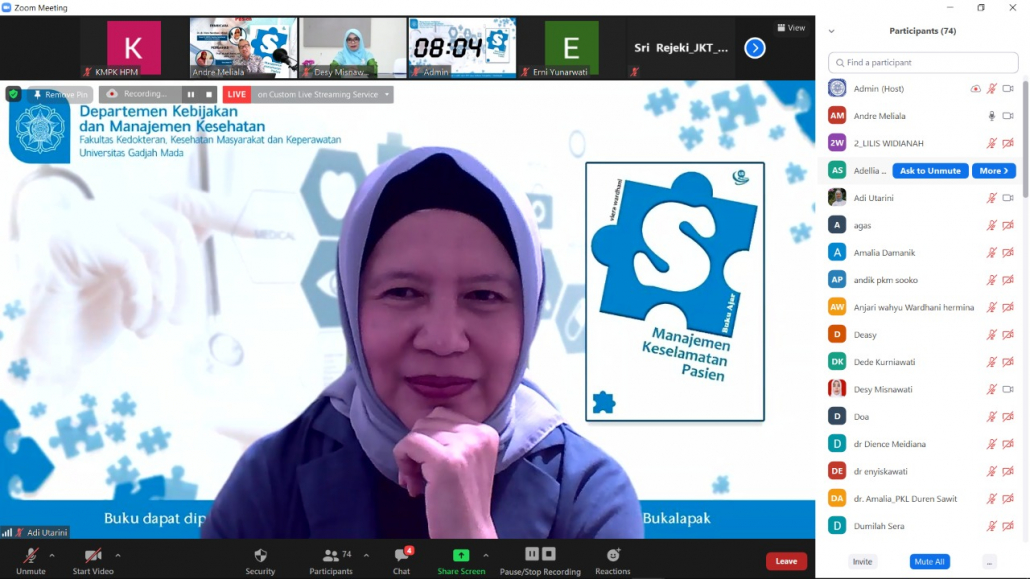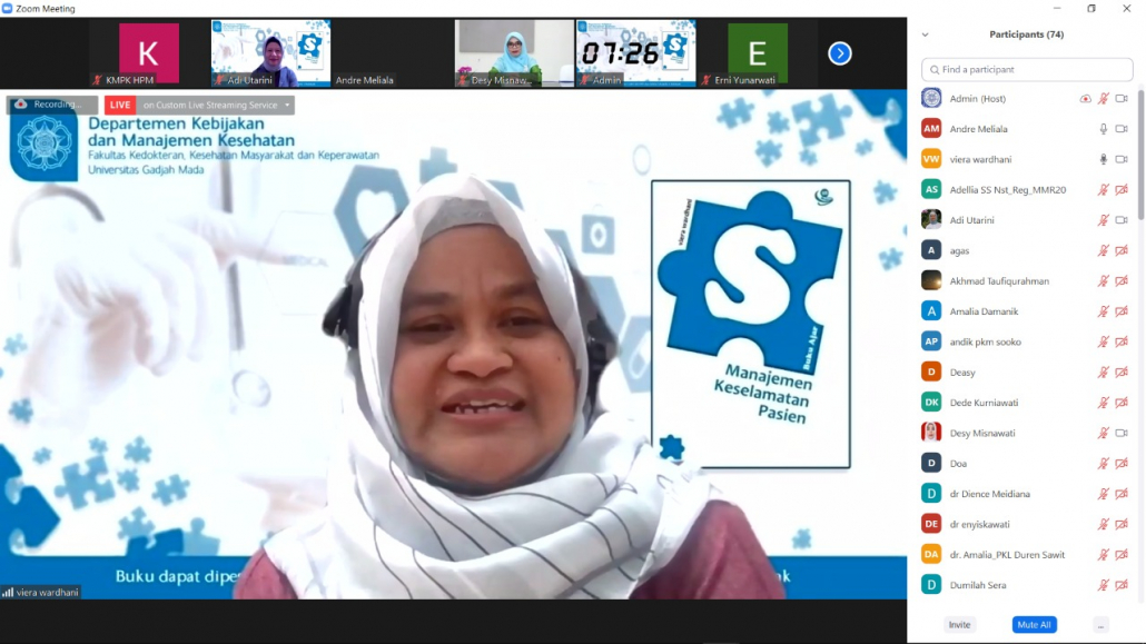 Departemen Kebijakan dan Manajemen Kesehatan FK-KMK UGM telah menyelenggarakan Bedah Buku #6 (Tahap 2) dengan judul buku “Manajemen Keselamatan Pasien” pada hari Rabu, 13 Januari 2021 mulai pukul 15.30-16.30 WIB melalui media online meeting zoom. Kegiatan ini diadakan dalam dua tahap. Tahap I bertujuan untuk mengenalkan buku agar menarik pembaca untuk membaca terlebih dahulu. Kemudian pada tahap II akan mengundang pembahas untuk berdiskusi dan tanya jawab terkait isi buku lebih dalam. Diskusi dibuka dengan pengantar oleh Prof. dr. Laksono Trisnantoro, M.Sc., Ph.D. (Kepala Departemen Kebijakan dan Manajemen Kesehatan FK-KMK UGM) dan dipandu oleh Dr. dr. Andreasta Meliala, DPH., M.Kes., MAS. (Ketua Pusat Kebijakan Manajemen Kesehatan FK-KMK UGM ) selaku moderator, memberikan dan menanyakan pandangan serta makna unik dari buku “Manjemen Keselamatan Pasien” yang diulas langsung oleh sang penulis buku Dr. dr. Viera Wardhani, M.Kes. (Dosen S2 MMRS Fakultas Kedokteran Universitas Brawijaya-Malang). Pengulasan lebih mendalam dikembangkan dengan cukup tajam oleh Prof. dr. Adi Utarini, M.Sc., MPH., Ph.D. (Guru Besar FK-KMK UGM).