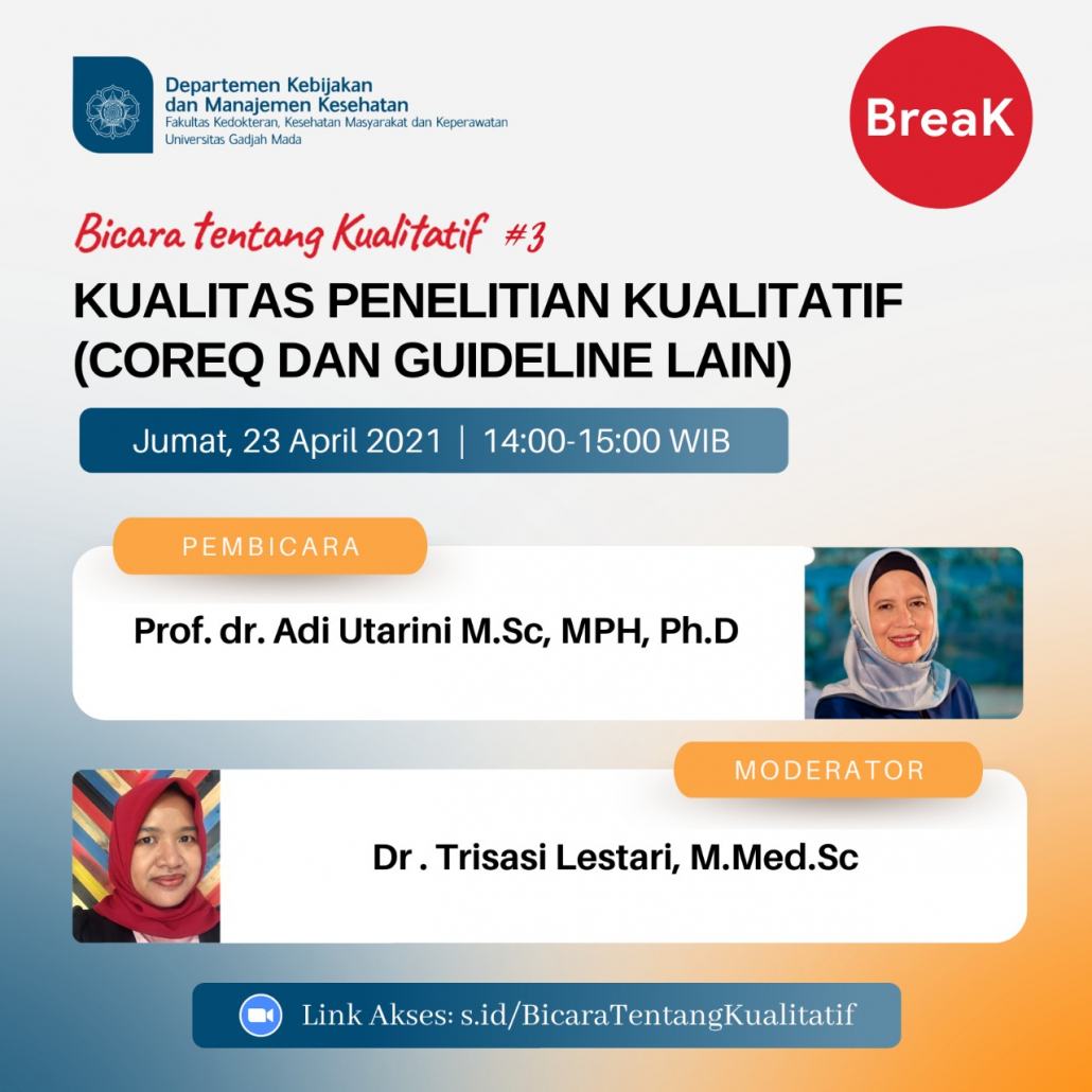 BreaK (Bicara tentang Kualitatif) #3 “Kualitas Penelitian Kualitatif (COREQ dan guideline lain)” – Prof. Adi Utarini, M.Sc, MPH, Ph.D